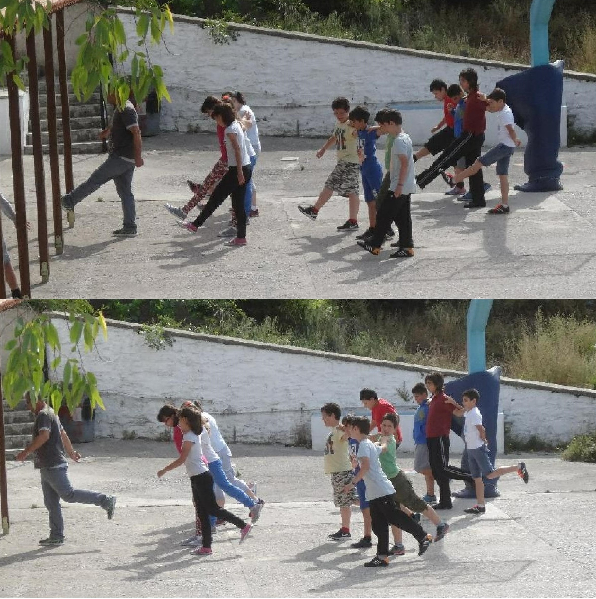 June 2015 - Local children being taught the 'Sirtos' dance in the school playground. There are many variants of this dance ranging from very basic to very complex. Every Greek person learns it whether or not they live in Greece.