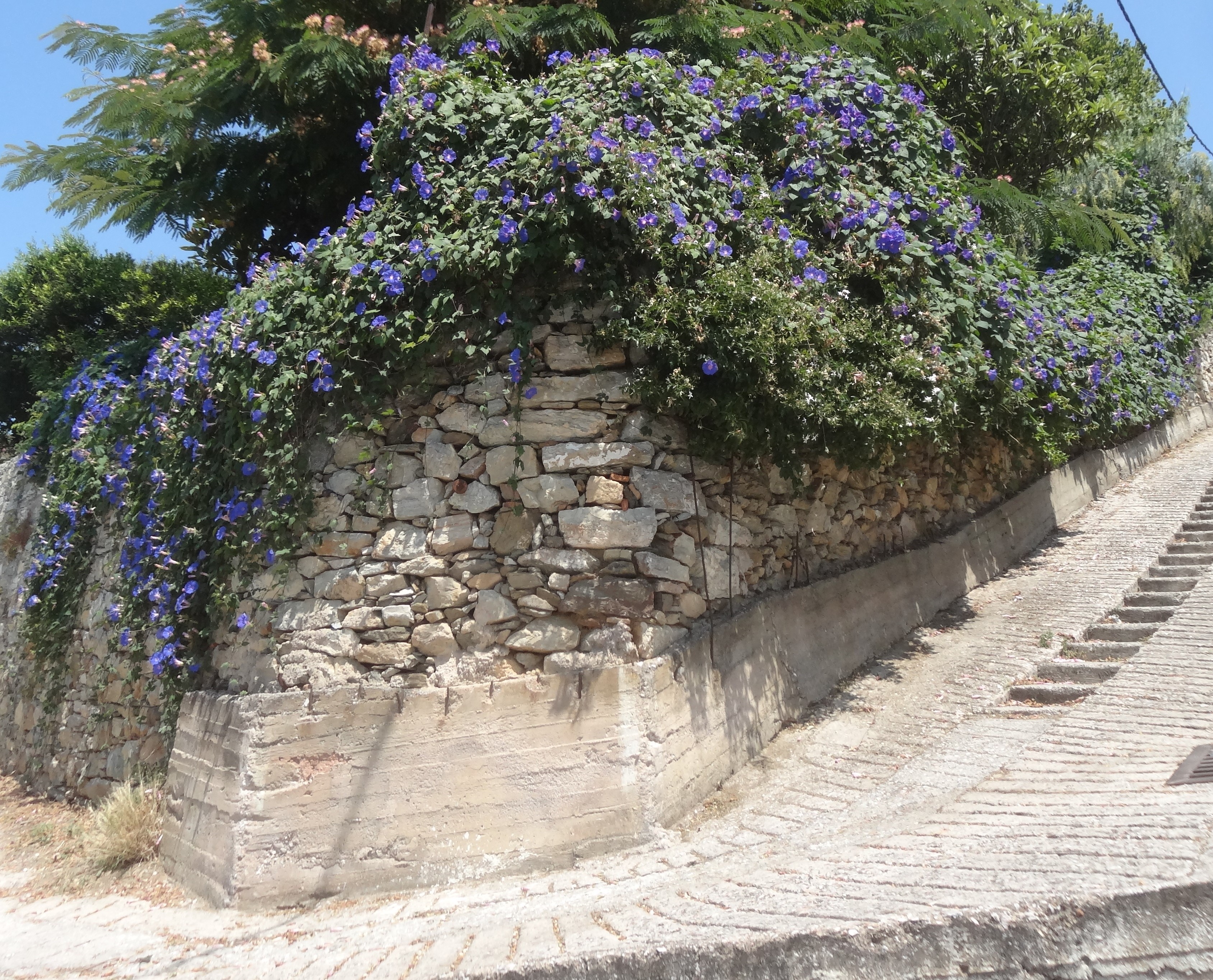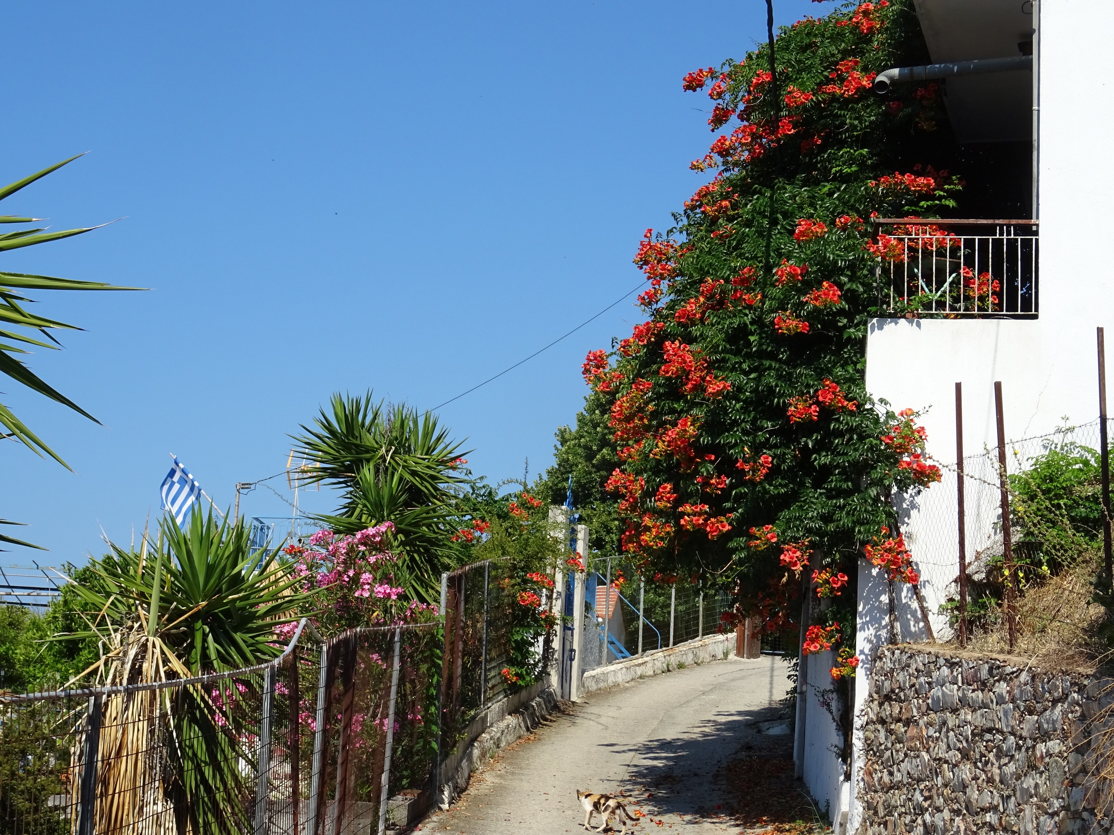 June 2017 - Quintessentially Greek - a trumpet vine, a cat, a yucca and a Greek flag on the back road, the shortest route from the cottage into Glossa.